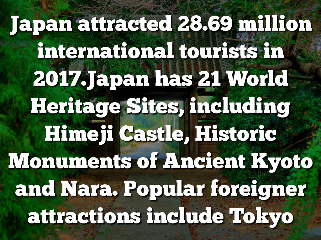Japan attracted 28.69 million international tourists in 2017.Japan has 21 World Heritage Sites, including Himeji Castle, Historic Monuments of Ancient Kyoto and Nara. Popular foreigner attractions include Tokyo