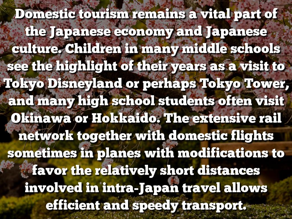 Domestic tourism remains a vital part of the Japanese economy and Japanese culture. Children in many middle schools see the highlight of their years as a visit to Tokyo Disneyland or perhaps Tokyo Tower, and many high school students often visit Okinawa or Hokkaido. The extensive rail network together with domestic flights sometimes in planes with modifications to favor the relatively short distances involved in intra-Japan travel allows efficient and speedy transport.