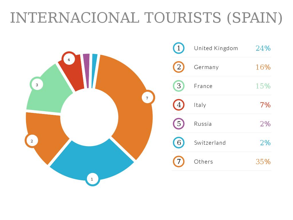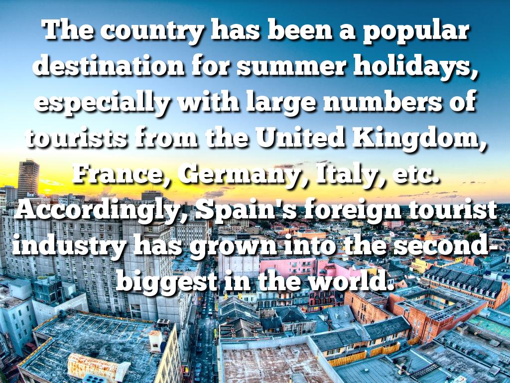 The country has been a popular destination for summer holidays, especially with large numbers of tourists from the United Kingdom, France, Germany, Italy, etc. Accordingly, Spain's foreign tourist industry has grown into the second-biggest in the world.