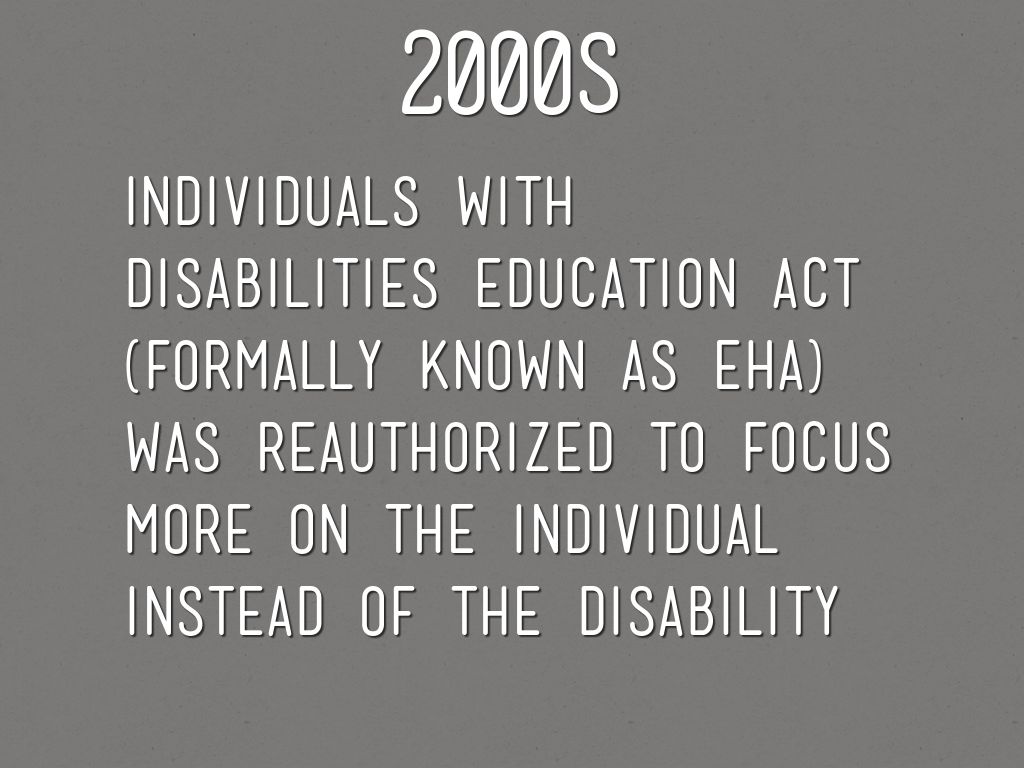 Individuals with Disabilities Education Act (formally known as EHA) was reauthorized to focus more on the individual instead of the disability