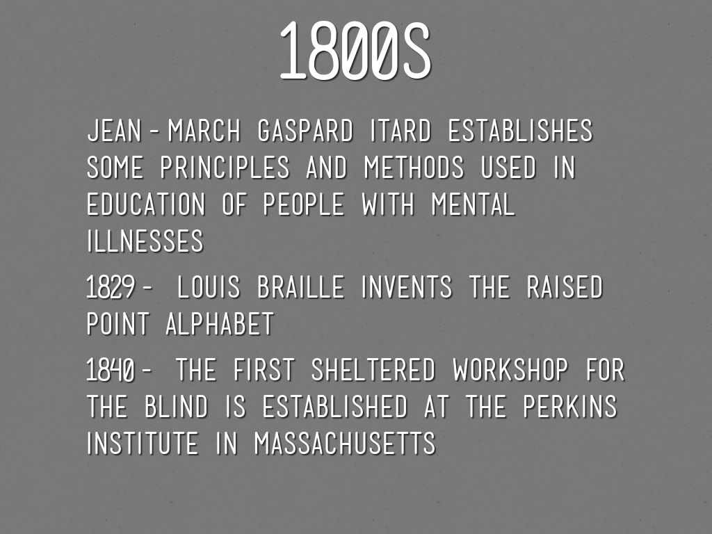 1840- The first sheltered workshop for the Blind is established at the Perkins Institute in Massachusetts