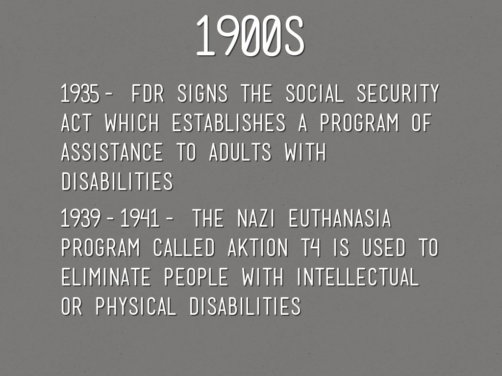 1935- FDR signs the Social Security Act which establishes a program of assistance to adults with disabilities