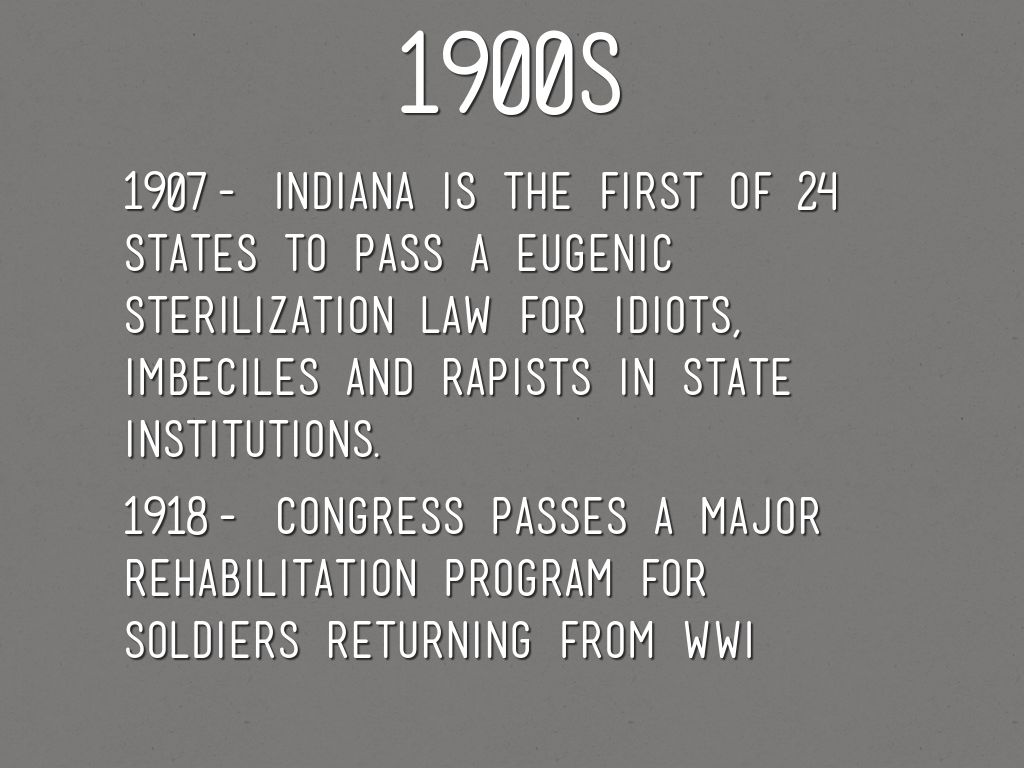 1907- Indiana is the first of 24 states to pass a eugenic sterilization law for idiots, imbeciles and rapists in state institutions.