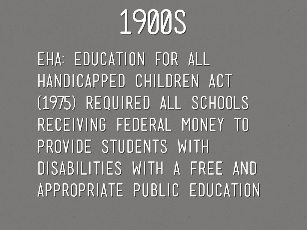 EHA: Education for All Handicapped Children Act (1975) required all schools receiving federal money to provide students with disabilities with a Free and Appropriate Public Education