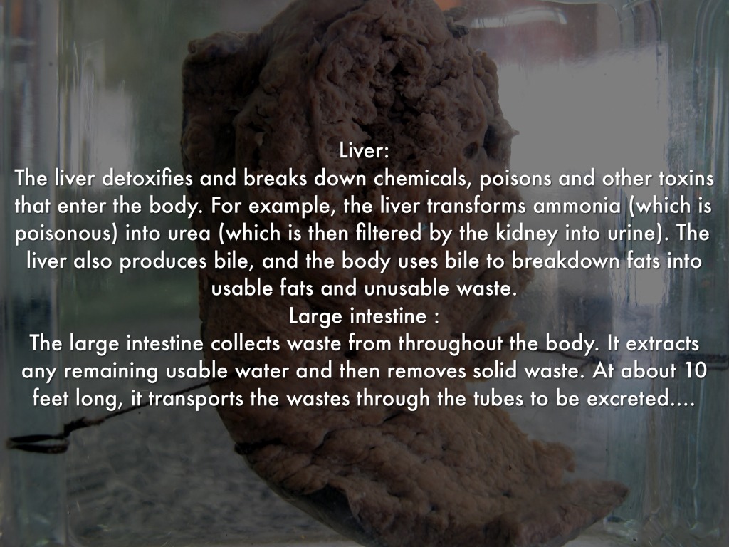 The liver detoxifies and breaks down chemicals, poisons and other toxins that enter the body. For example, the liver transforms ammonia (which is poisonous) into urea (which is then filtered by the kidney into urine). The liver also produces bile, and the body uses bile to breakdown fats into usable fats and unusable waste.