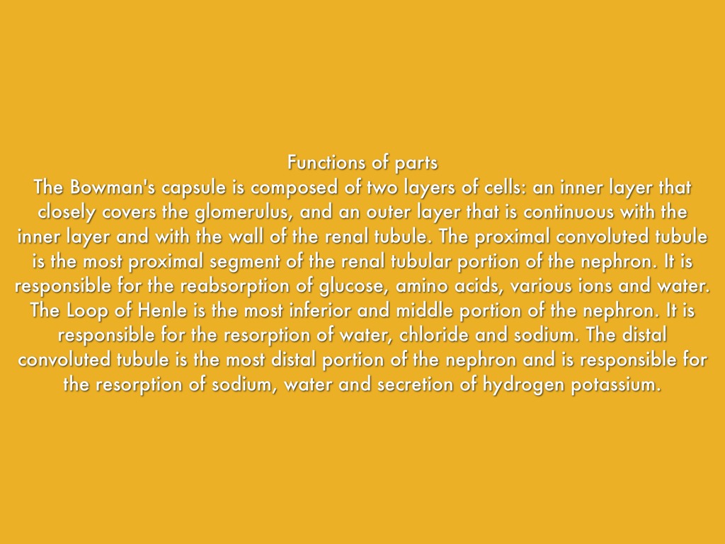 The Bowman's capsule is composed of two layers of cells: an inner layer that closely covers the glomerulus, and an outer layer that is continuous with the inner layer and with the wall of the renal tubule. The proximal convoluted tubule is the most proximal segment of the renal tubular portion of the nephron. It is responsible for the reabsorption of glucose, amino acids, various ions and water. The Loop of Henle is the most inferior and middle portion of the nephron. It is responsible for the resorption of water, chloride and sodium. The distal convoluted tubule is the most distal portion of the nephron and is responsible for the resorption of sodium, water and secretion of hydrogen potassium.