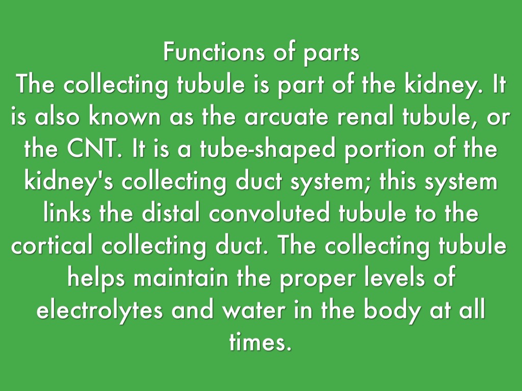The collecting tubule is part of the kidney. It is also known as the arcuate renal tubule, or the CNT. It is a tube-shaped portion of the kidney's collecting duct system; this system links the distal convoluted tubule to the cortical collecting duct. The collecting tubule helps maintain the proper levels of electrolytes and water in the body at all times.