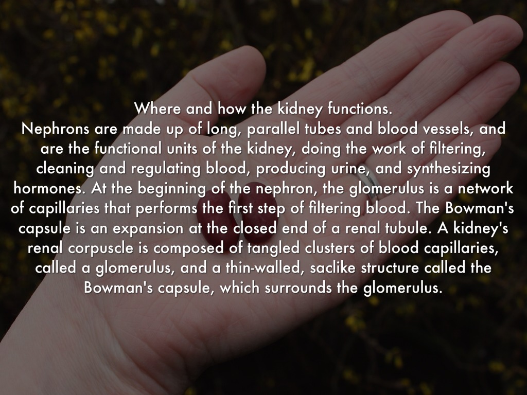 Nephrons are made up of long, parallel tubes and blood vessels, and are the functional units of the kidney, doing the work of filtering, cleaning and regulating blood, producing urine, and synthesizing hormones. At the beginning of the nephron, the glomerulus is a network of capillaries that performs the first step of filtering blood. The Bowman's capsule is an expansion at the closed end of a renal tubule. A kidney's renal corpuscle is composed of tangled clusters of blood capillaries, called a glomerulus, and a thin-walled, saclike structure called the Bowman's capsule, which surrounds the glomerulus.