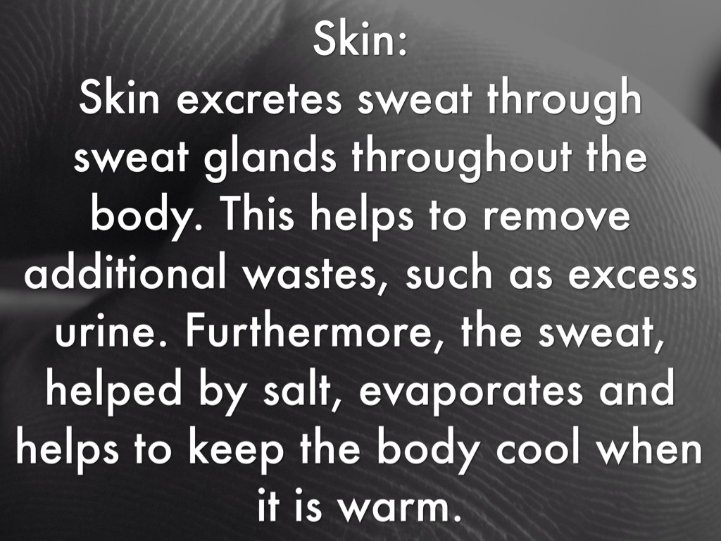 Skin excretes sweat through sweat glands throughout the body. This helps to remove additional wastes, such as excess urine. Furthermore, the sweat, helped by salt, evaporates and helps to keep the body cool when it is warm.