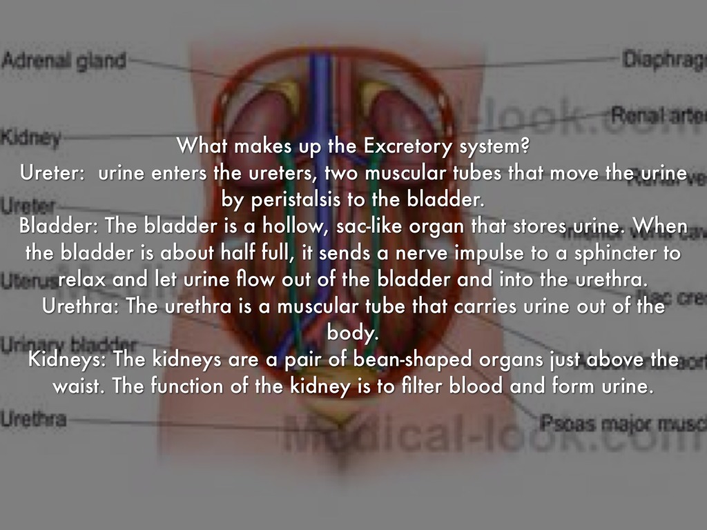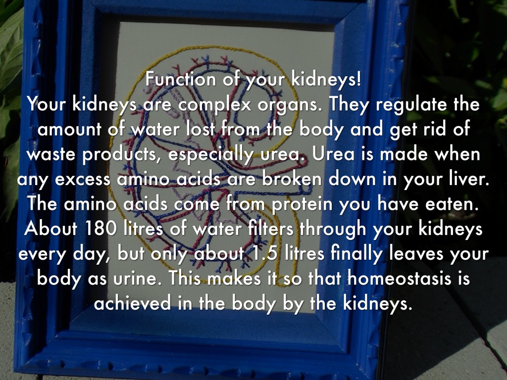 Your kidneys are complex organs. They regulate the amount of water lost from the body and get rid of waste products, especially urea. Urea is made when any excess amino acids are broken down in your liver. The amino acids come from protein you have eaten.