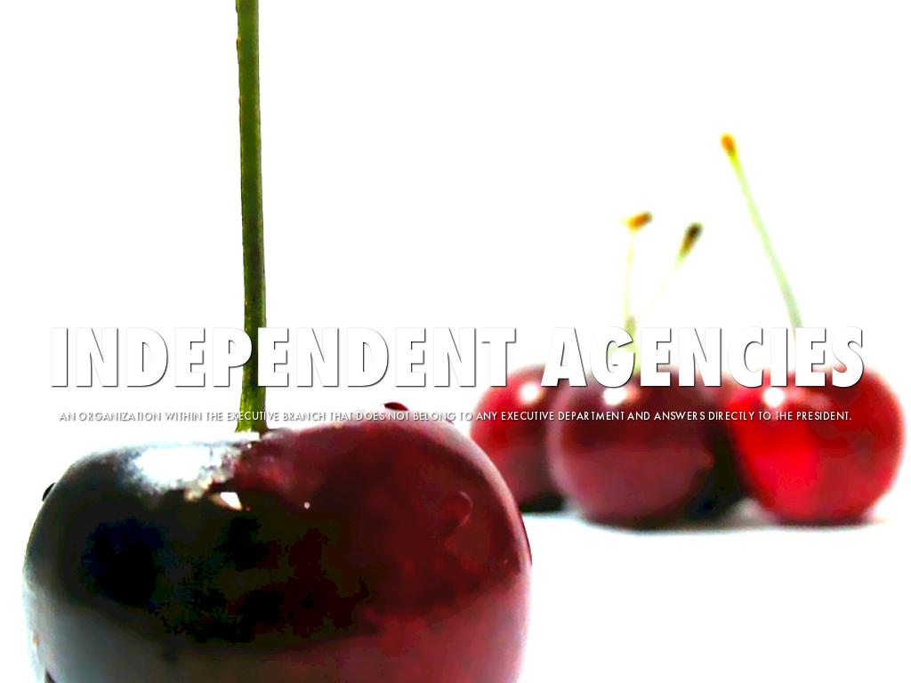 This picture shows one lonely cherry compared to a group of cherries. That means basically the single cherry is doing and handling things themselves with out a lot of help. That represents independent agencies.
