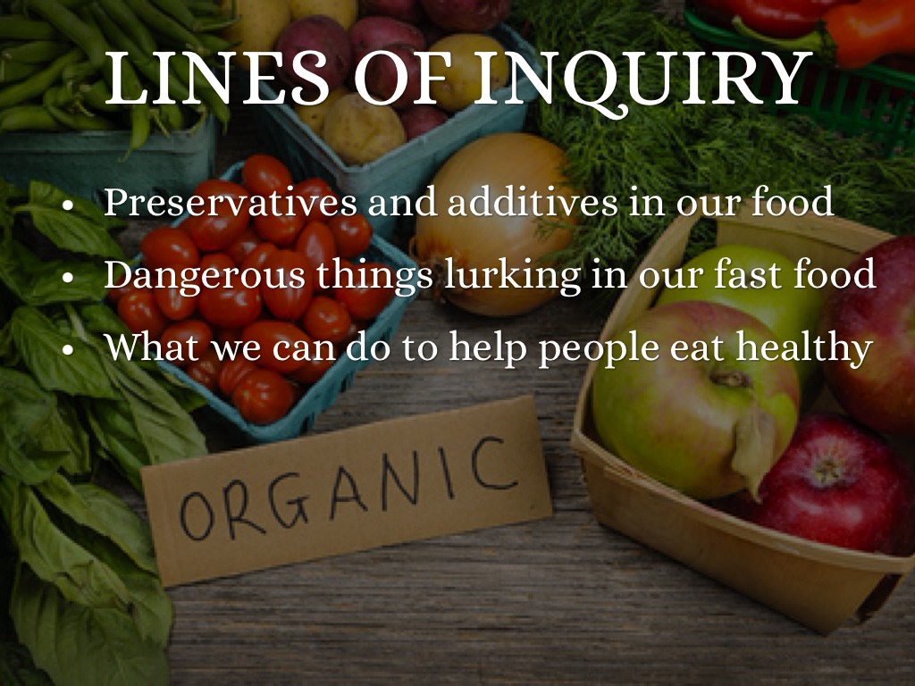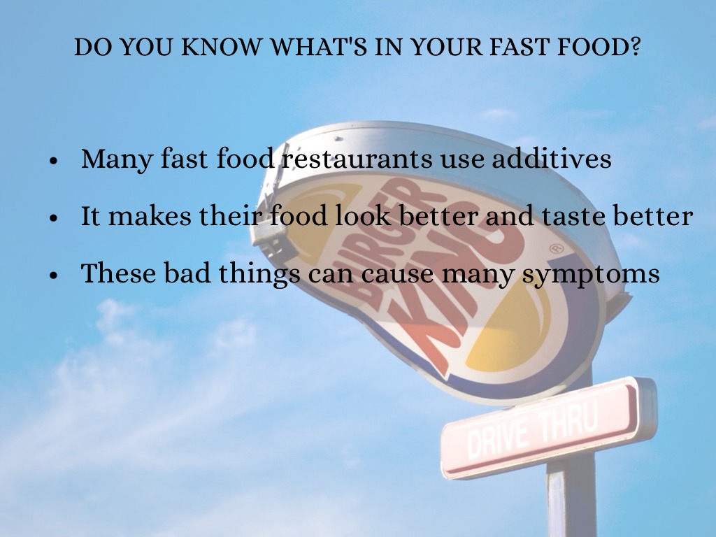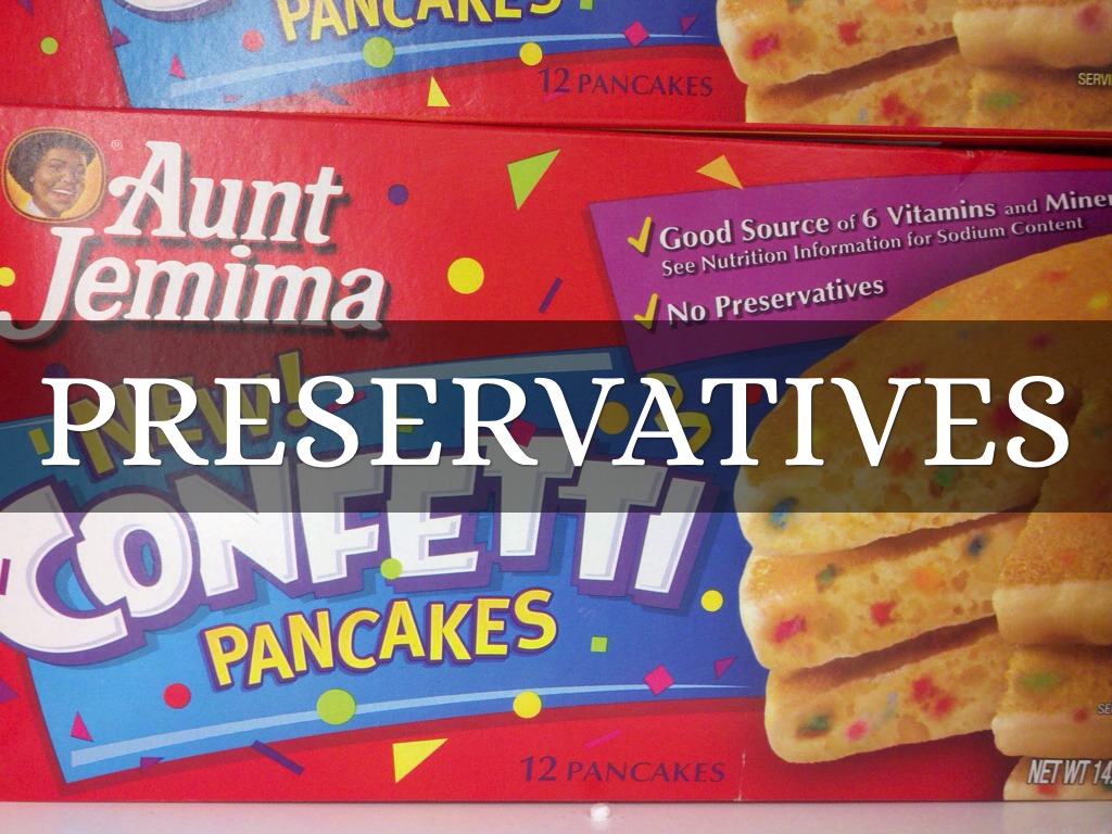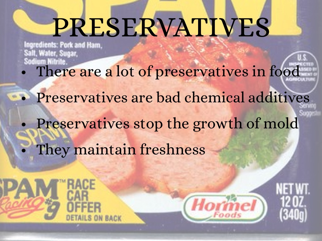 In foods there are a lot of chemical additives. That is in there because it stops the growth of mold. Preservatives are bad for our health and it effects our bodies. Preservatives also help maintain freshness and the look of food.