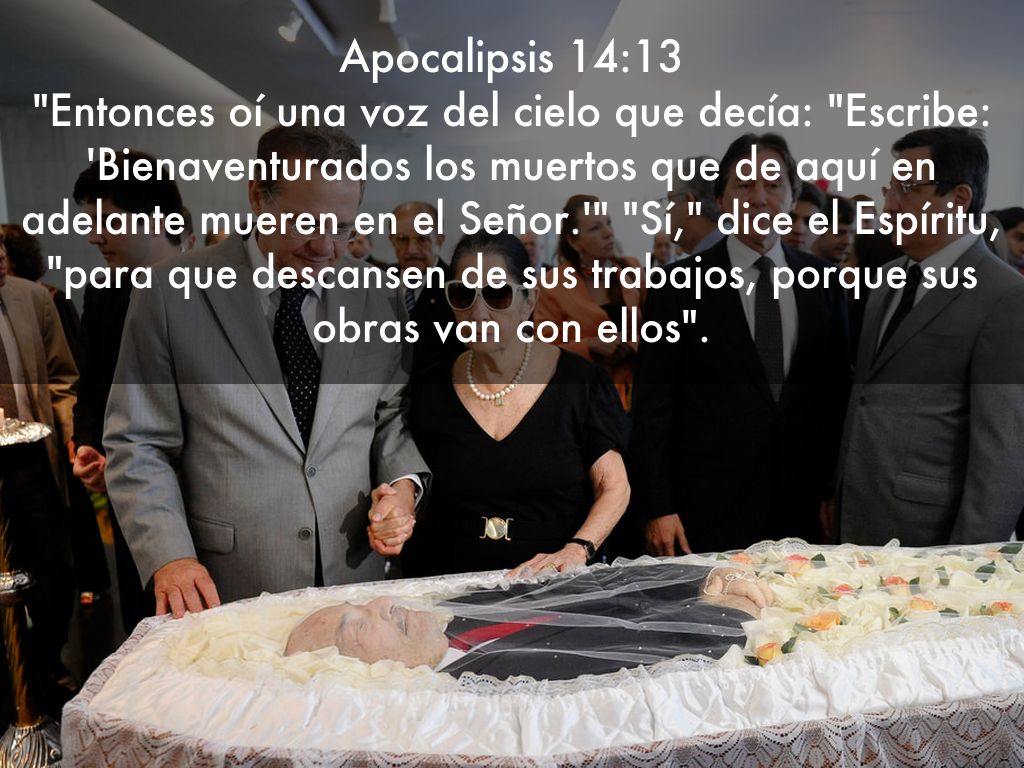 Apocalipsis 14:13 "Entonces oí una voz del cielo que decía: "Escribe: 'Bienaventurados los muertos que de aquí en adelante mueren en el Señor.'" "Sí," dice el Espíritu, "para que descansen de sus trabajos, porque sus obras van con ellos".