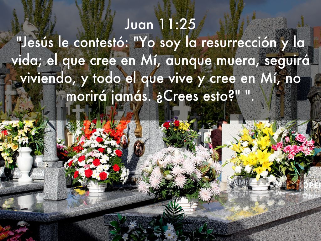 Juan 11:25 "Jesús le contestó: "Yo soy la resurrección y la vida; el que cree en Mí, aunque muera, seguirá viviendo, y todo el que vive y cree en Mí, no morirá jamás. ¿Crees esto?" ".