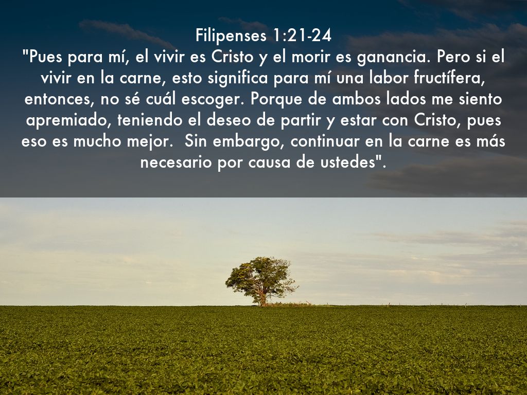 Filipenses 1:21-24 "Pues para mí, el vivir es Cristo y el morir es ganancia. Pero si el vivir en la carne, esto significa para mí una labor fructífera, entonces, no sé cuál escoger. Porque de ambos lados me siento apremiado, teniendo el deseo de partir y estar con Cristo, pues eso es mucho mejor. Sin embargo, continuar en la carne es más necesario por causa de ustedes".