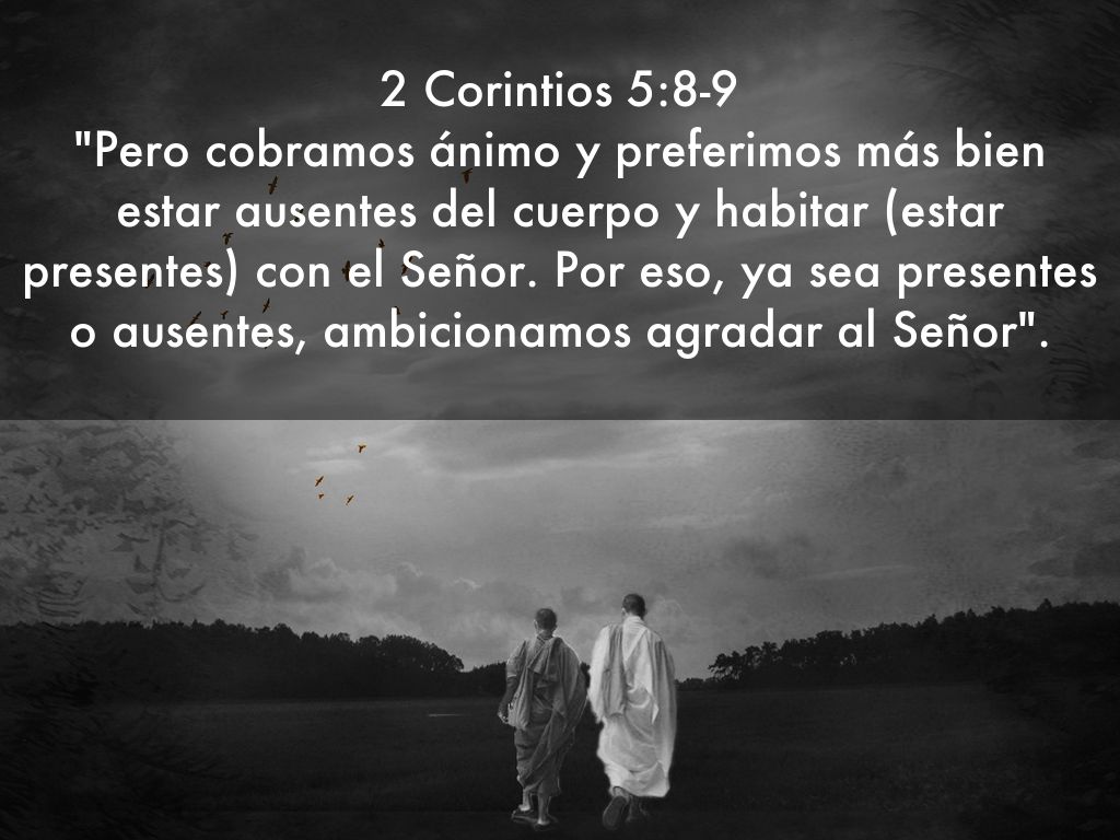 2 Corintios 5:8-9 "Pero cobramos ánimo y preferimos más bien estar ausentes del cuerpo y habitar (estar presentes) con el Señor. Por eso, ya sea presentes o ausentes, ambicionamos agradar al Señor".