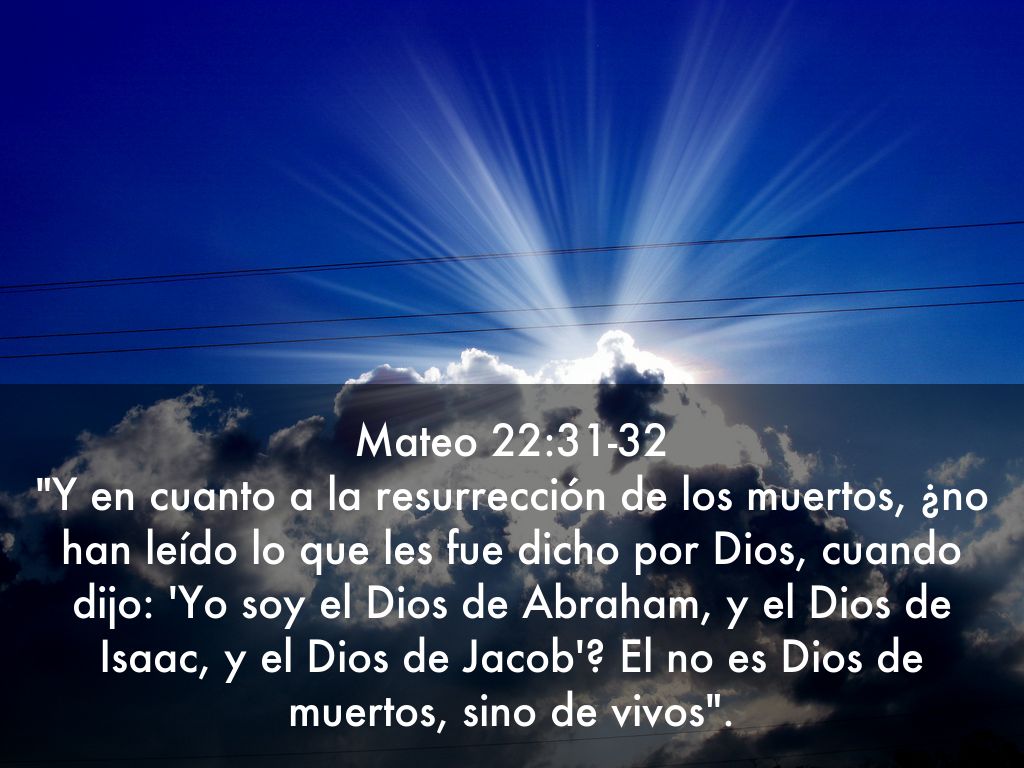 Mateo 22:31-32 "Y en cuanto a la resurrección de los muertos, ¿no han leído lo que les fue dicho por Dios, cuando dijo: 'Yo soy el Dios de Abraham, y el Dios de Isaac, y el Dios de Jacob'? El no es Dios de muertos, sino de vivos".