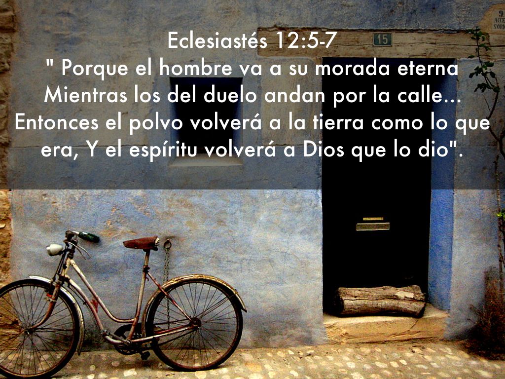Eclesiastés 12:5-7 " Porque el hombre va a su morada eterna Mientras los del duelo andan por la calle... Entonces el polvo volverá a la tierra como lo que era, Y el espíritu volverá a Dios que lo dio".