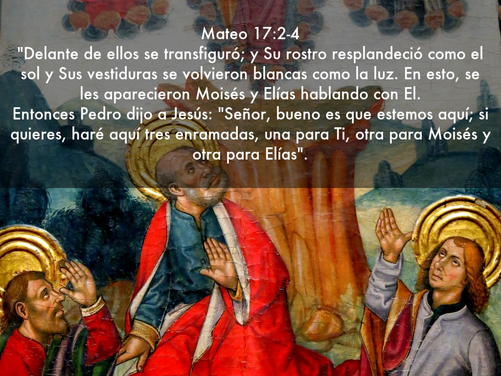 Mateo 17:2-4 "Delante de ellos se transfiguró; y Su rostro resplandeció como el sol y Sus vestiduras se volvieron blancas como la luz. En esto, se les aparecieron Moisés y Elías hablando con El. Entonces Pedro dijo a Jesús: "Señor, bueno es que estemos aquí; si quieres, haré aquí tres enramadas, una para Ti, otra para Moisés y otra para Elías".