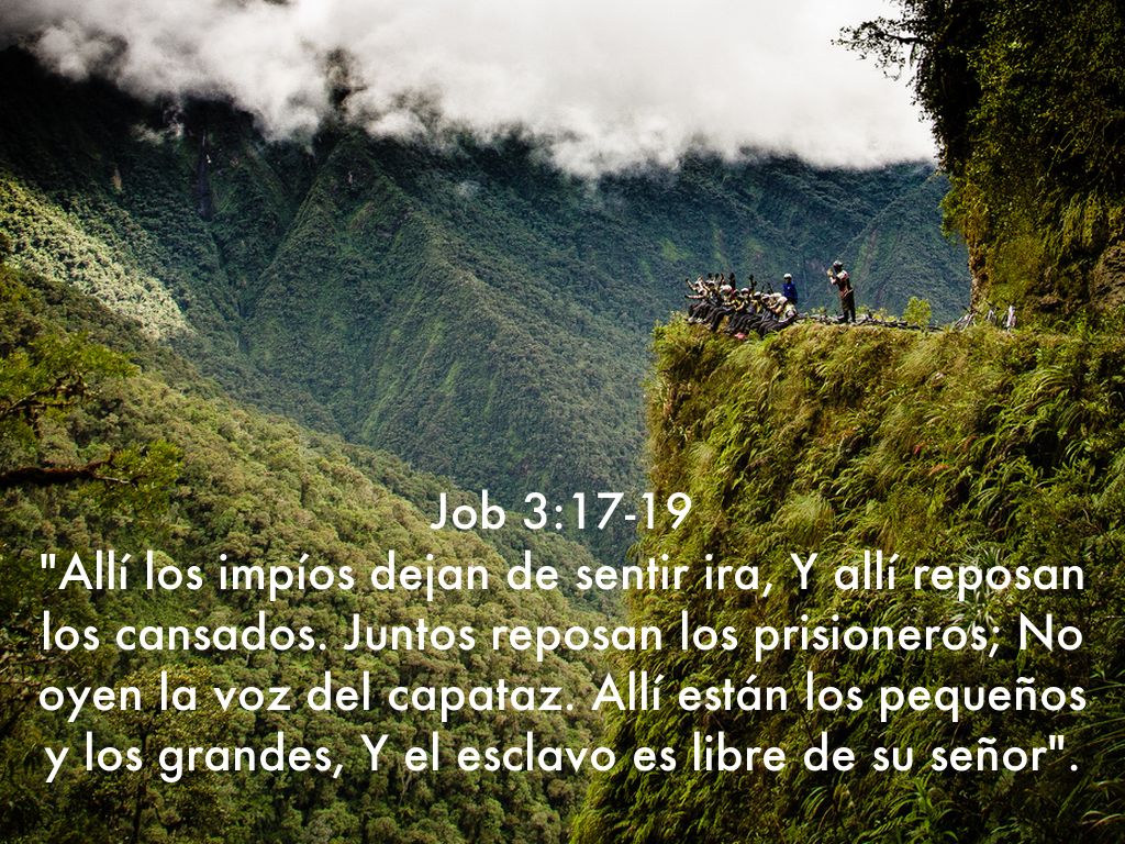 Job 3:17-19 "Allí los impíos dejan de sentir ira, Y allí reposan los cansados. Juntos reposan los prisioneros; No oyen la voz del capataz. Allí están los pequeños y los grandes, Y el esclavo es libre de su señor".