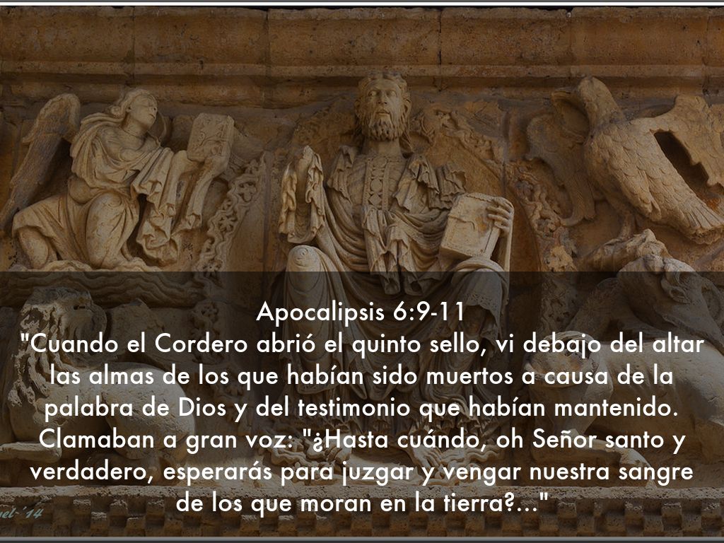 Apocalipsis 6:9-11 "Cuando el Cordero abrió el quinto sello, vi debajo del altar las almas de los que habían sido muertos a causa de la palabra de Dios y del testimonio que habían mantenido. Clamaban a gran voz: "¿Hasta cuándo, oh Señor santo y verdadero, esperarás para juzgar y vengar nuestra sangre de los que moran en la tierra?..."