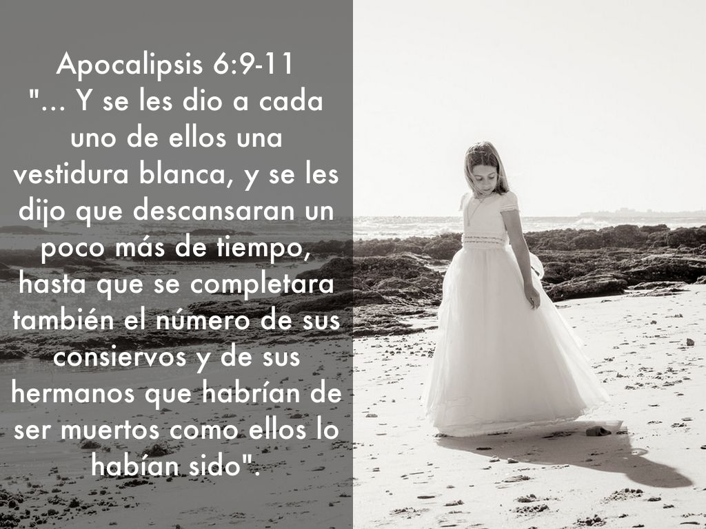 Apocalipsis 6:9-11 "... Y se les dio a cada uno de ellos una vestidura blanca, y se les dijo que descansaran un poco más de tiempo, hasta que se completara también el número de sus consiervos y de sus hermanos que habrían de ser muertos como ellos lo habían sido".