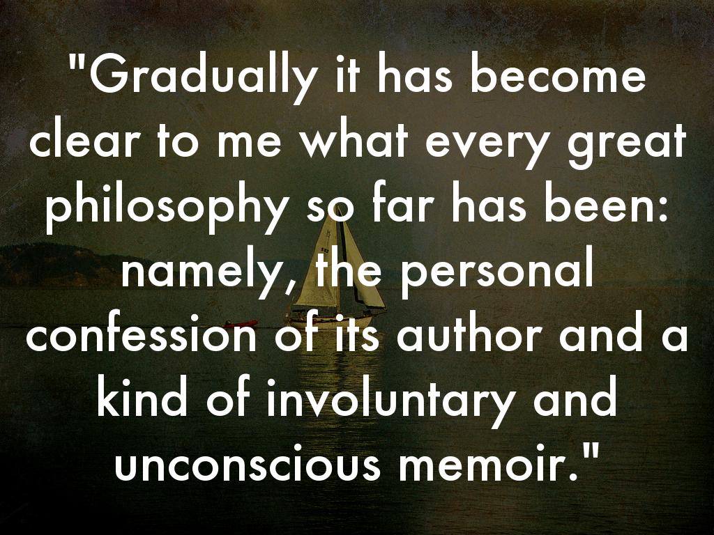"Gradually it has become clear to me what every great philosophy so far has been: namely, the personal confession of its author and a kind of involuntary and unconscious memoir."