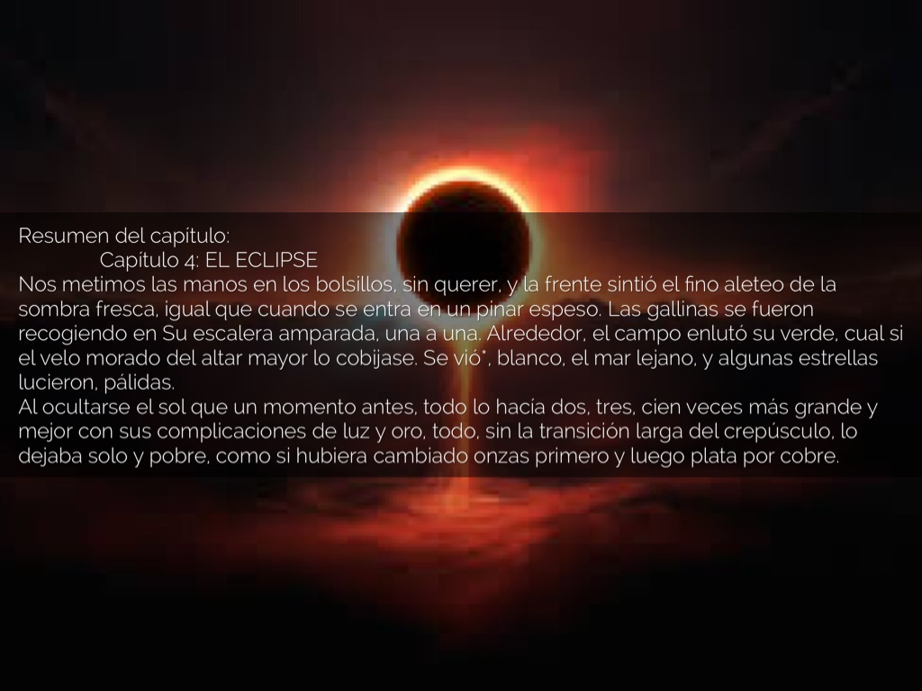 Nos metimos las manos en los bolsillos, sin querer, y la frente sintió el fino aleteo de la sombra fresca, igual que cuando se entra en un pinar espeso. Las gallinas se fueron recogiendo en Su escalera amparada, una a una. Alrededor, el campo enlutó su verde, cual si el velo morado del altar mayor lo cobijase. Se vió*, blanco, el mar lejano, y algunas estrellas lucieron, pálidas.
