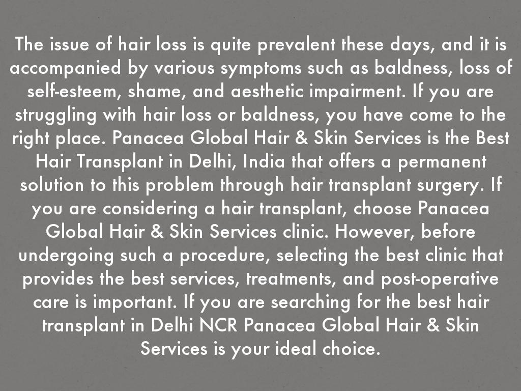 The issue of hair loss is quite prevalent these days, and it is accompanied by various symptoms such as baldness, loss of self-esteem, shame, and aesthetic impairment. If you are struggling with hair loss or baldness, you have come to the right place. Panacea Global Hair & Skin Services is the Best Hair Transplant in Delhi, India that offers a permanent solution to this problem through hair transplant surgery. If you are considering a hair transplant, choose Panacea Global Hair & Skin Services clinic. However, before undergoing such a procedure, selecting the best clinic that provides the best services, treatments, and post-operative care is important. If you are searching for the best hair transplant in Delhi NCR Panacea Global Hair & Skin Services is your ideal choice.