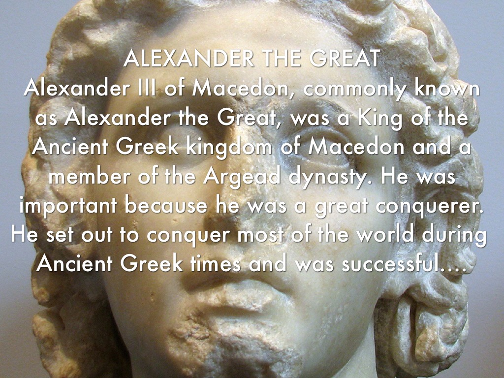 Alexander III of Macedon, commonly known as Alexander the Great, was a King of the Ancient Greek kingdom of Macedon and a member of the Argead dynasty. He was important because he was a great conquerer. He set out to conquer most of the world during Ancient Greek times and was successful.