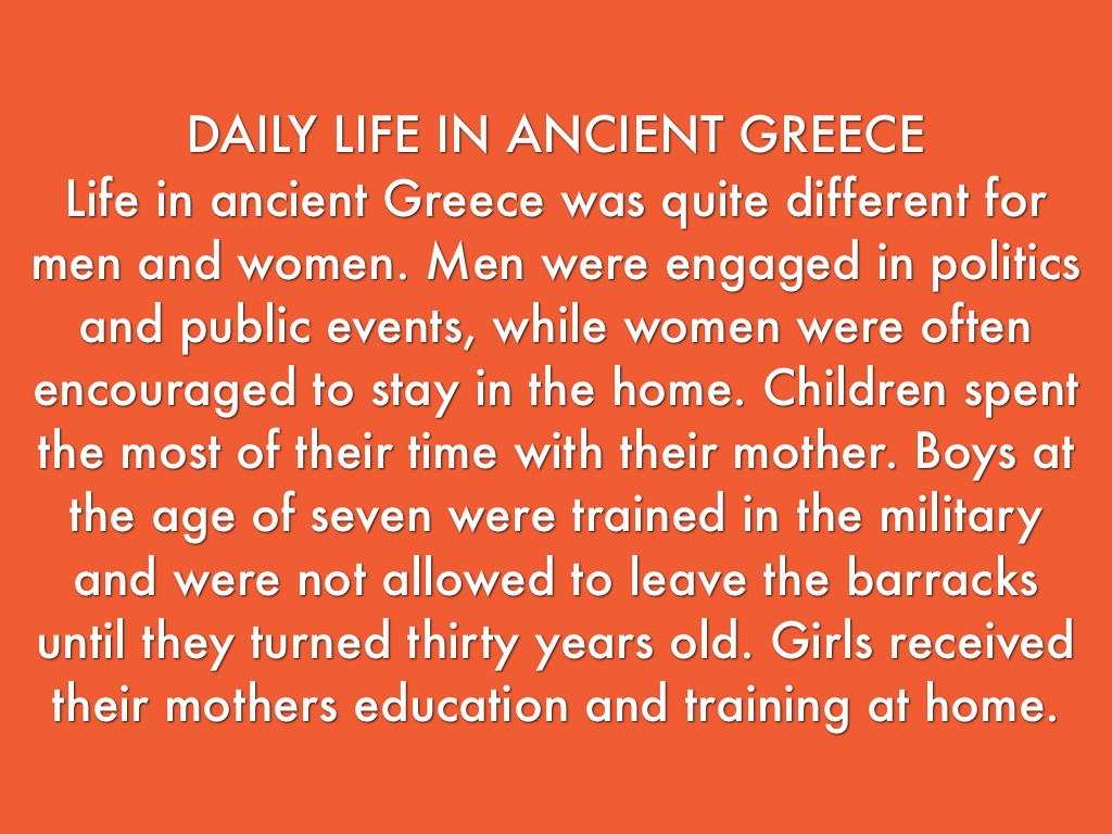 Life in ancient Greece was quite different for men and women. Men were engaged in politics and public events, while women were often encouraged to stay in the home. Children spent the most of their time with their mother. Boys at the age of seven were trained in the military and were not allowed to leave the barracks until they turned thirty years old. Girls received their mothers education and training at home.