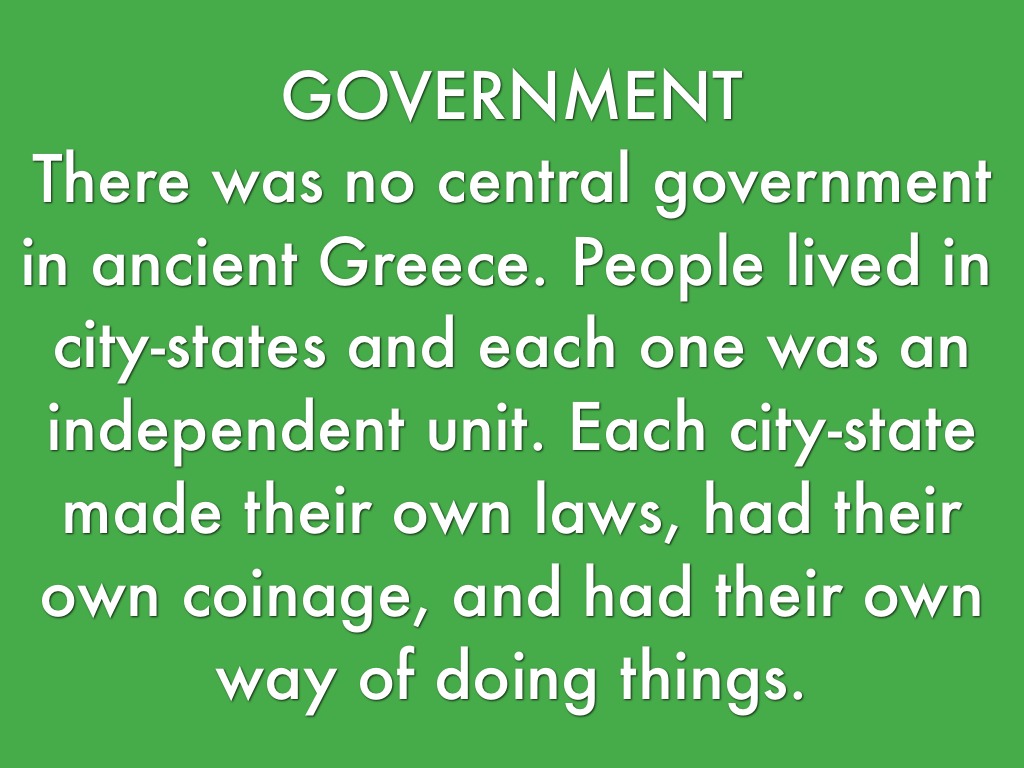 There was no central government in ancient Greece. People lived in city-states and each one was an independent unit. Each city-state made their own laws, had their own coinage, and had their own way of doing things.