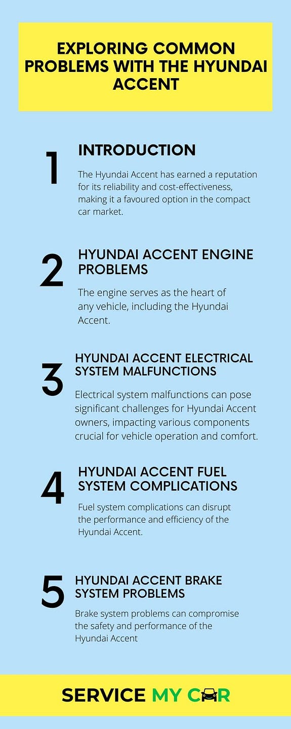 The Hyundai Accent stands as a popular choice among compact car enthusiasts, offering affordability, fuel efficiency, and a stylish design. However, like any vehicle, it is not immune to certain common issues that owners may encounter over time. In this comprehensive guide, we'll delve into some of the most frequently reported problems with the Hyundai Accent, along with tips on how to address them. Additionally, we'll introduce "Service My Car," a company dedicated to providing all types of car services, including those for the Hyundai Accent.