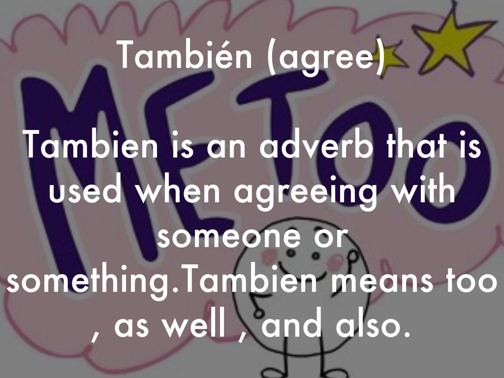 Tambien is an adverb that is used when agreeing with someone or something.Tambien means too , as well , and also.