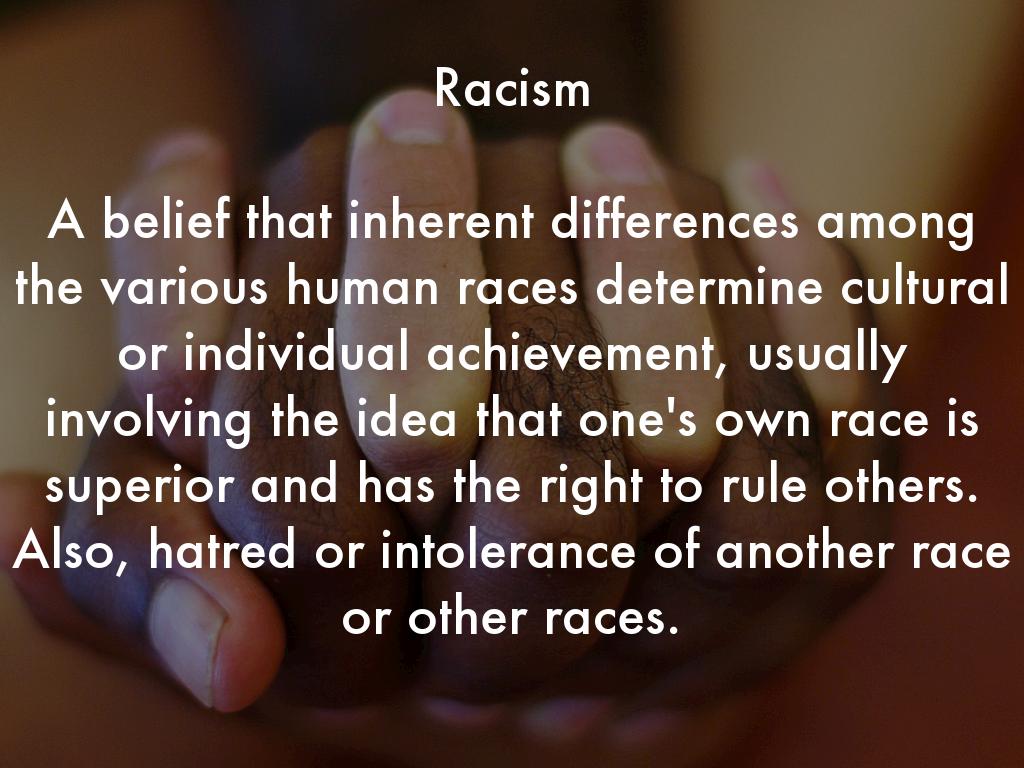 A belief that inherent differences among the various human races determine cultural or individual achievement, usually involving the idea that one's own race is superior and has the right to rule others. Also, hatred or intolerance of another race or other races.