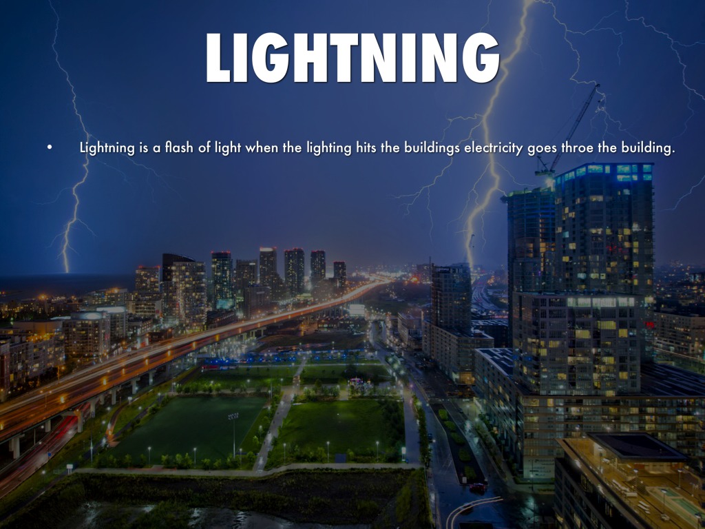 Lightning is a flash of light when the lighting hits the buildings electricity goes throe the building.