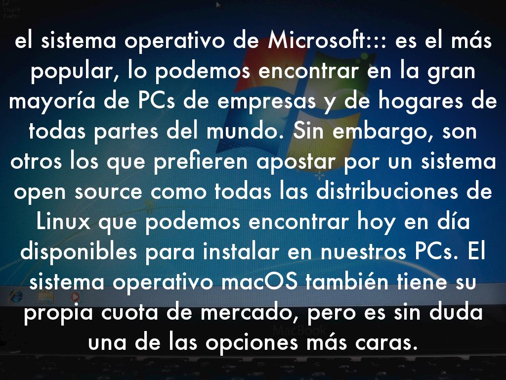 el sistema operativo de Microsoft::: es el más popular, lo podemos encontrar en la gran mayoría de PCs de empresas y de hogares de todas partes del mundo. Sin embargo, son otros los que prefieren apostar por un sistema open source como todas las distribuciones de Linux que podemos encontrar hoy en día disponibles para instalar en nuestros PCs. El sistema operativo macOS también tiene su propia cuota de mercado, pero es sin duda una de las opciones más caras.