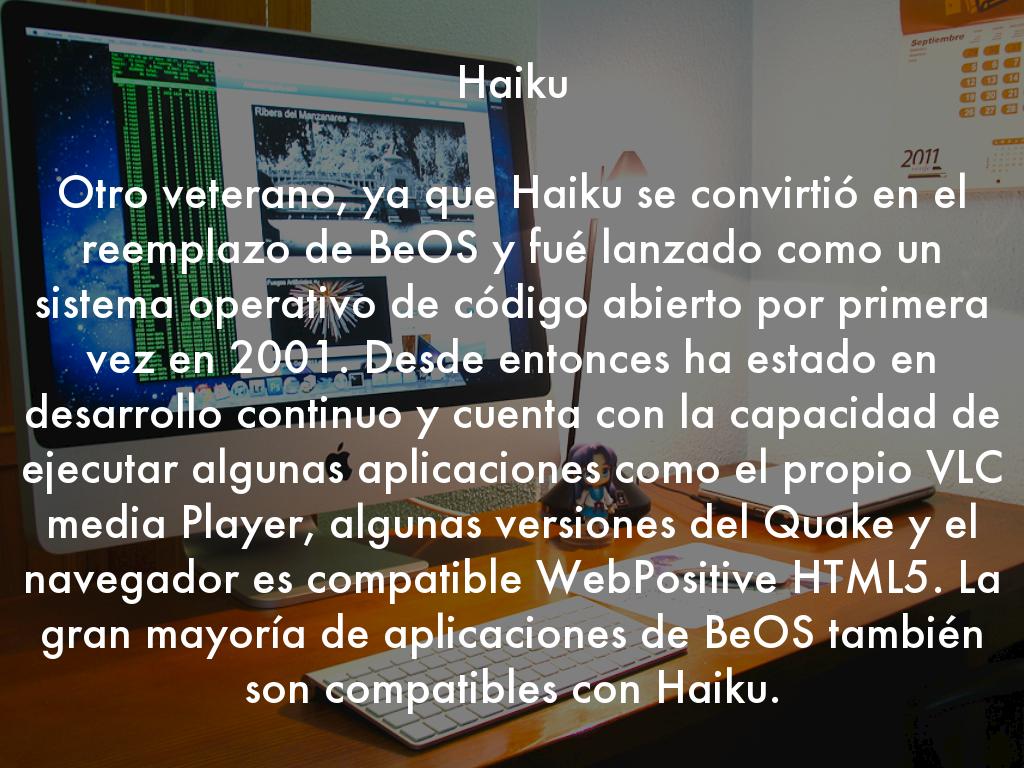 Otro veterano, ya que Haiku se convirtió en el reemplazo de BeOS y fué lanzado como un sistema operativo de código abierto por primera vez en 2001. Desde entonces ha estado en desarrollo continuo y cuenta con la capacidad de ejecutar algunas aplicaciones como el propio VLC media Player, algunas versiones del Quake y el navegador es compatible WebPositive HTML5. La gran mayoría de aplicaciones de BeOS también son compatibles con Haiku.