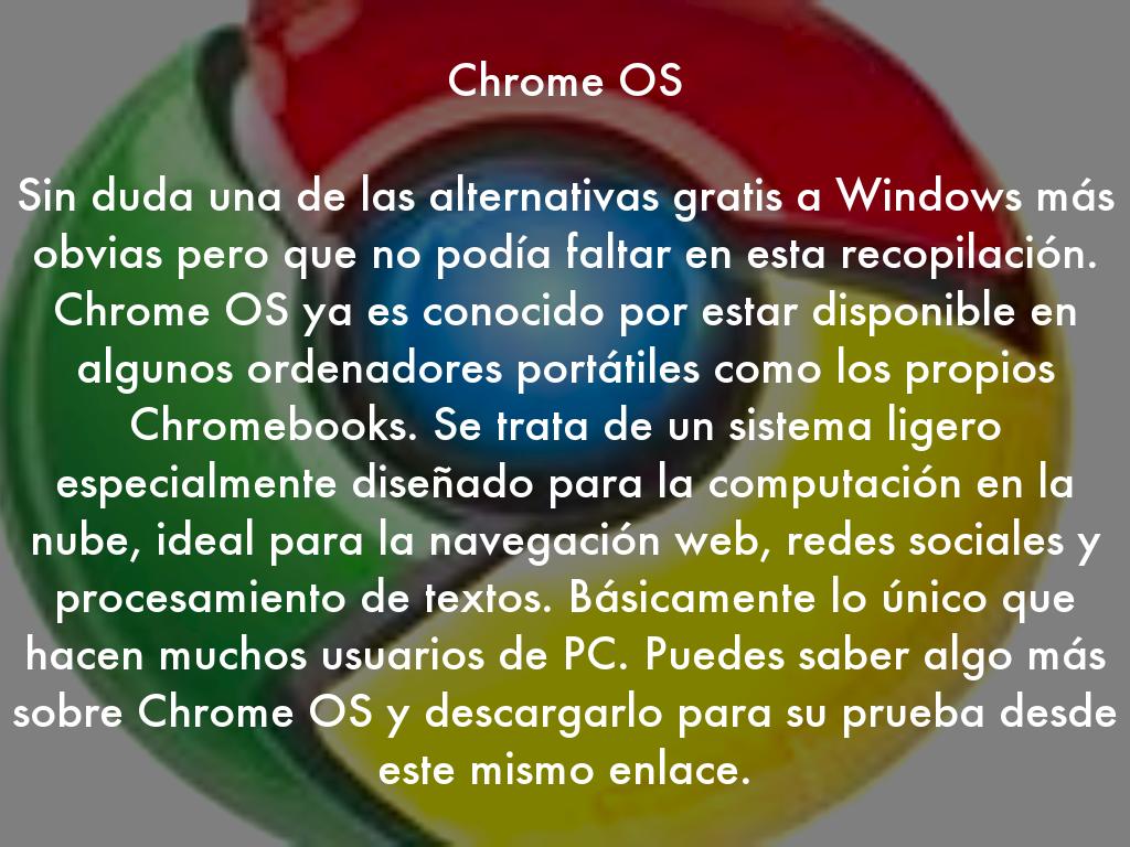 Sin duda una de las alternativas gratis a Windows más obvias pero que no podía faltar en esta recopilación. Chrome OS ya es conocido por estar disponible en algunos ordenadores portátiles como los propios Chromebooks. Se trata de un sistema ligero especialmente diseñado para la computación en la nube, ideal para la navegación web, redes sociales y procesamiento de textos. Básicamente lo único que hacen muchos usuarios de PC. Puedes saber algo más sobre Chrome OS y descargarlo para su prueba desde este mismo enlace.