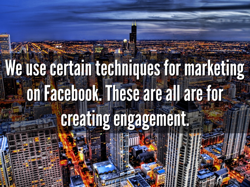We use certain techniques for marketing on Facebook. These are all are for creating engagement.