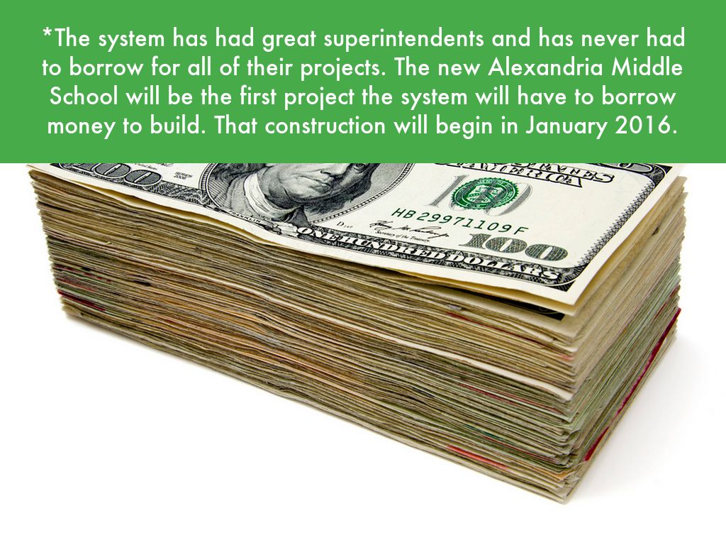 *The system has had great superintendents and has never had to borrow for all of their projects. The new Alexandria Middle School will be the first project the system will have to borrow money to build. That construction will begin in January 2016.