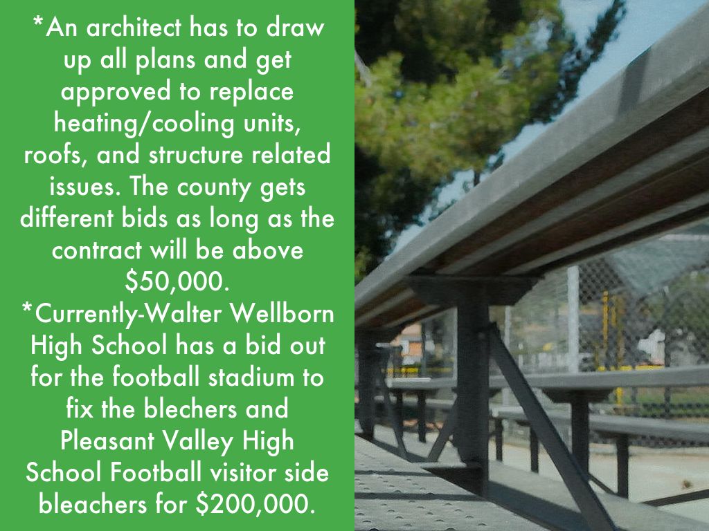*An architect has to draw up all plans and get approved to replace heating/cooling units, roofs, and structure related issues. The county gets different bids as long as the contract will be above $50,000. *Currently-Walter Wellborn High School has a bid out for the football stadium to fix the blechers and Pleasant Valley High School Football visitor side bleachers for $200,000.