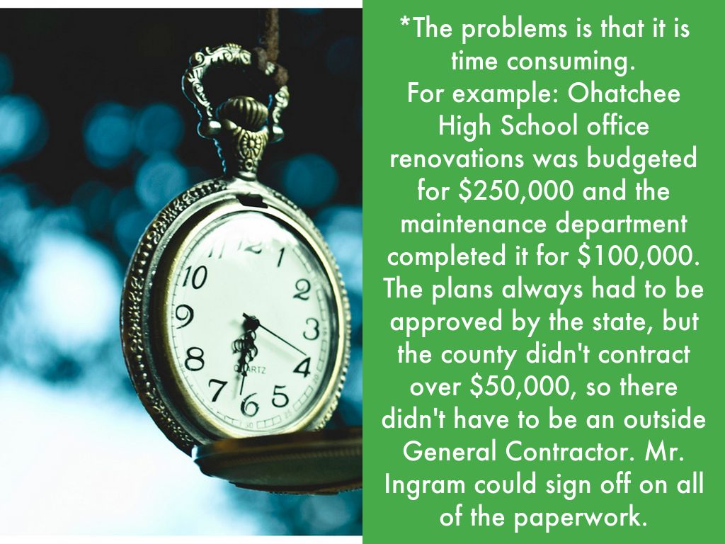 *The problems is that it is time consuming. For example: Ohatchee High School office renovations was budgeted for $250,000 and the maintenance department completed it for $100,000. The plans always had to be approved by the state, but the county didn't contract over $50,000, so there didn't have to be an outside General Contractor. Mr. Ingram could sign off on all of the paperwork.