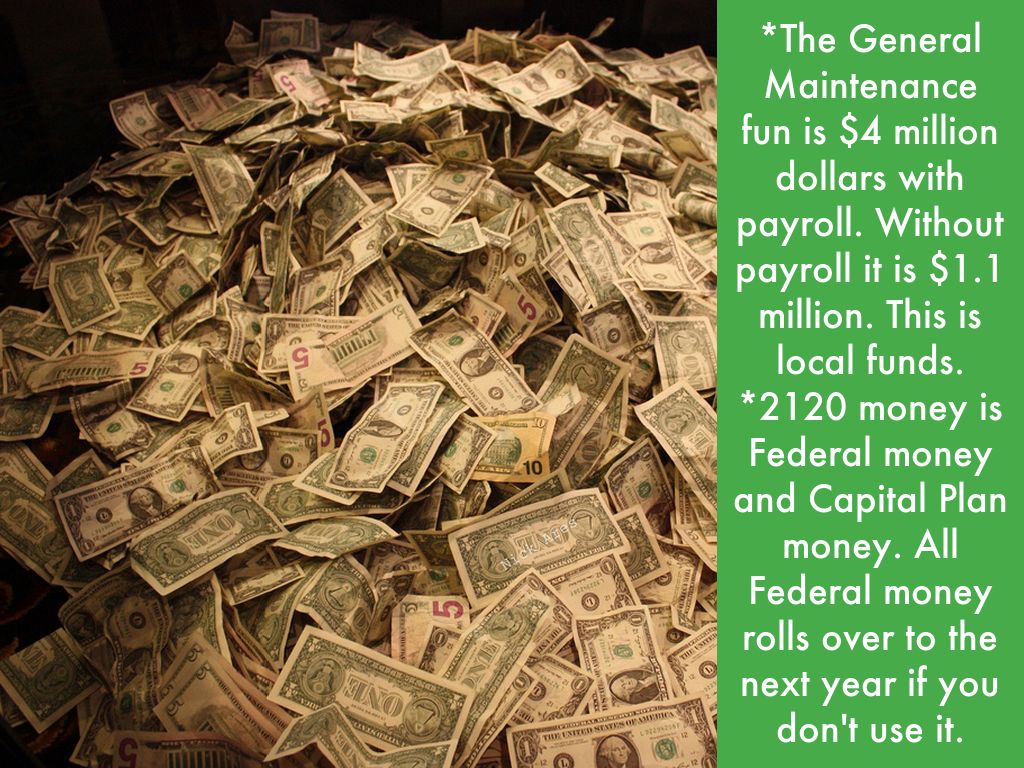 *The General Maintenance fun is $4 million dollars with payroll. Without payroll it is $1.1 million. This is local funds. *2120 money is Federal money and Capital Plan money. All Federal money rolls over to the next year if you don't use it.