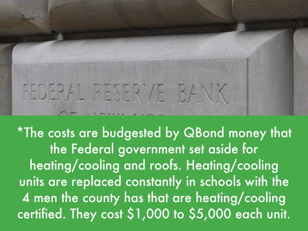 *The costs are budgested by QBond money that the Federal government set aside for heating/cooling and roofs. Heating/cooling units are replaced constantly in schools with the 4 men the county has that are heating/cooling certified. They cost $1,000 to $5,000 each unit.