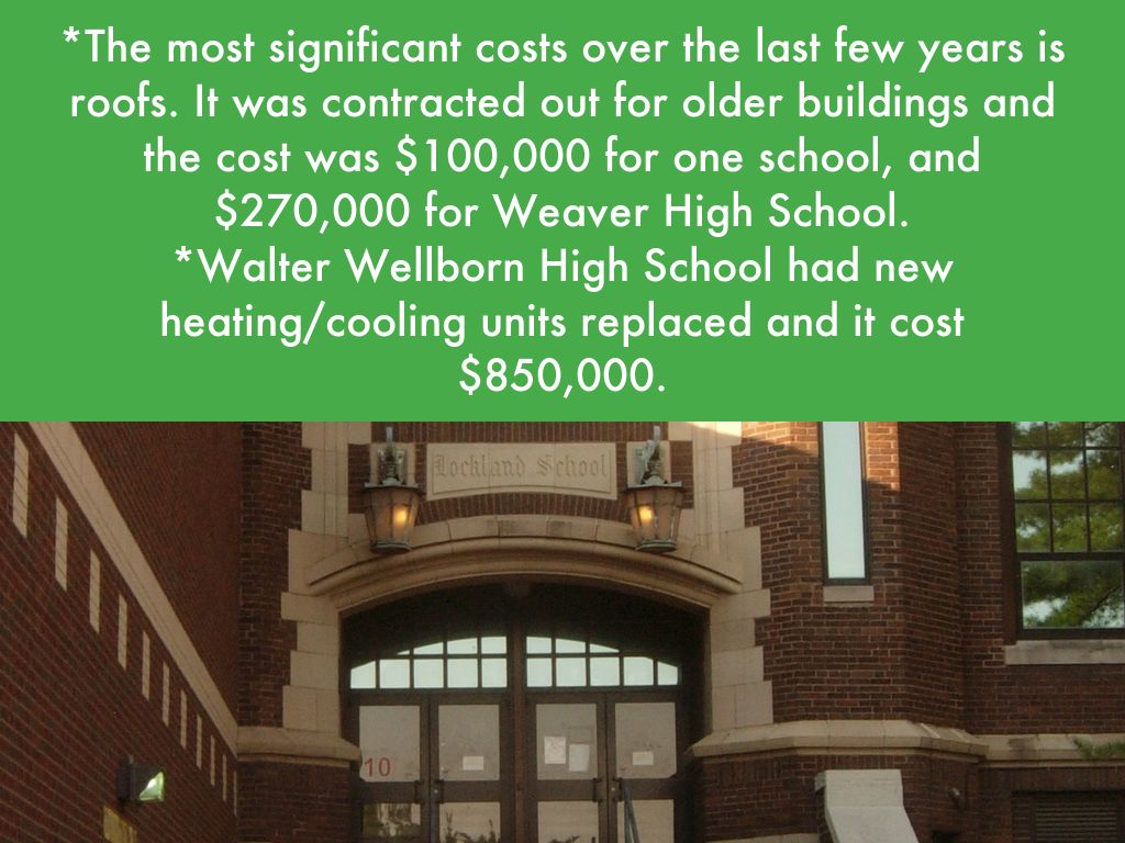 *The most significant costs over the last few years is roofs. It was contracted out for older buildings and the cost was $100,000 for one school, and $270,000 for Weaver High School. *Walter Wellborn High School had new heating/cooling units replaced and it cost $850,000.
