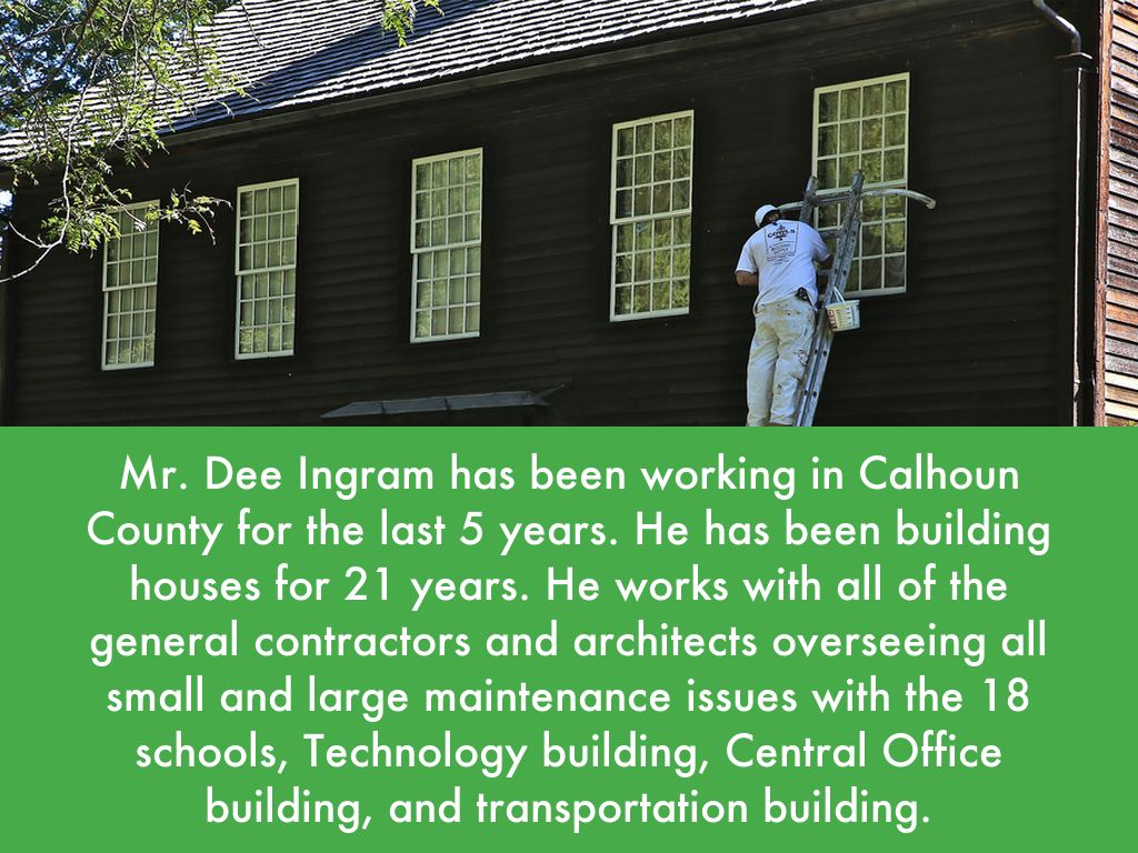 Mr. Dee Ingram has been working in Calhoun County for the last 5 years. He has been building houses for 21 years. He works with all of the general contractors and architects overseeing all small and large maintenance issues with the 18 schools, Technology building, Central Office building, and transportation building.