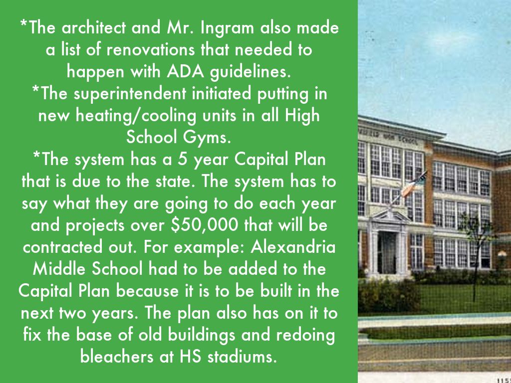 *The architect and Mr. Ingram also made a list of renovations that needed to happen with ADA guidelines. *The superintendent initiated putting in new heating/cooling units in all High School Gyms. *The system has a 5 year Capital Plan that is due to the state. The system has to say what they are going to do each year and projects over $50,000 that will be contracted out. For example: Alexandria Middle School had to be added to the Capital Plan because it is to be built in the next two years. The plan also has on it to fix the base of old buildings and redoing bleachers at HS stadiums.
