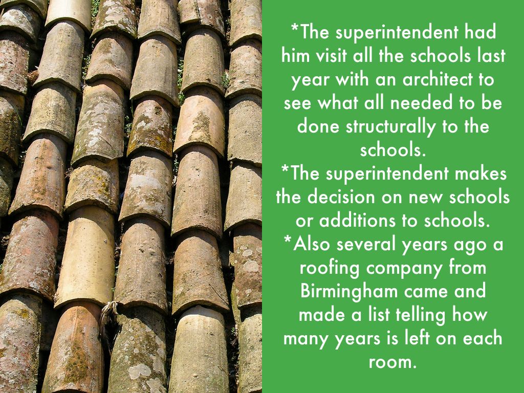 *The superintendent had him visit all the schools last year with an architect to see what all needed to be done structurally to the schools. *The superintendent makes the decision on new schools or additions to schools. *Also several years ago a roofing company from Birmingham came and made a list telling how many years is left on each room.