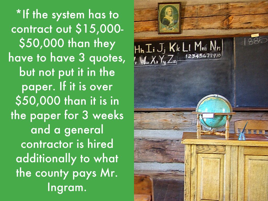 *If the system has to contract out $15,000-$50,000 than they have to have 3 quotes, but not put it in the paper. If it is over $50,000 than it is in the paper for 3 weeks and a general contractor is hired additionally to what the county pays Mr. Ingram.